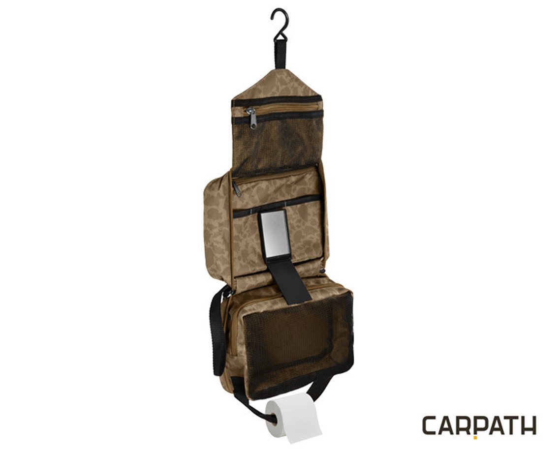 Taška je vybavená praktickým popruhom na suchý zips, ktorý je doplnený o plastový háčik. To umožňuje zavesenie tašky v bivaku, alebo na kmeň či konár stromu a podobne. Na opačnom konci sme umiestnili popruh na suchý zips, ktorý prevlečiete stredom rolky toaletného papiera a spojíte. Následne viete tento toaletný papier bez problémov odvíjať. Vo vnútri sa nachádza vrecko na toaletný papier a ďalšie praktické odkladacie priestory, ktoré sú uzatvárateľné zipsom. V strednej časti sa nachádzajú 3 prepážky, do ktorých si viete uložiť napríklad hrebeň, pinzetu, nožnice a iné. Nájdeme tu aj malé zrkadlo (5.5x8cm), ktoré je vybavené plastovou krytkou a pripevnené je k taštičke prostredníctvom suchého zipsu, a v prípade potreby si ho viete vybrať. Na vonkašej strane je taška vybavená pútkom pre jednoduchšie nosenie.